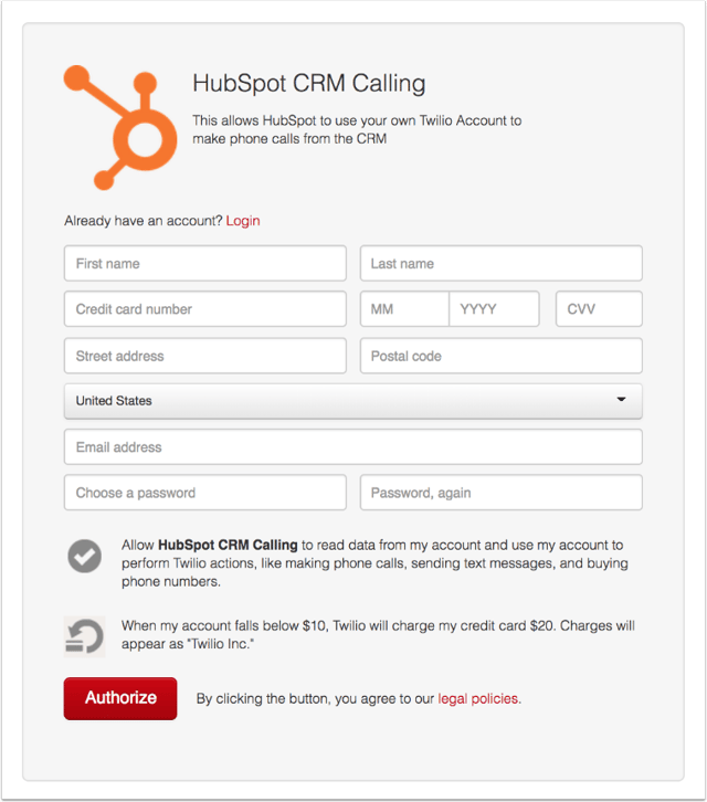 - You'll be redirected to Twilio to create an account or log in to your existing account to authorize the connection to HubSpot.