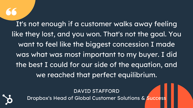 "On the flip side," He continues, "You want to make sure you're demonstrating maximum value to the customer. It's not enough if a customer walks away feeling like they lost, and you won. That's not the goal. You want to feel like the biggest concession I made was what was most important to my buyer. I did the best I could for our side of the equation, and we reached that perfect equilibrium."