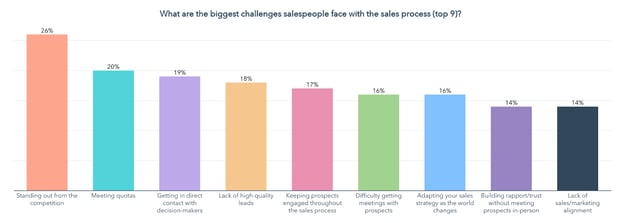 The top challenges salespeople face in 2022 are standing out from the competition, meeting quotas, getting in direct contact with decision-makers, a lack of high-quality leads, and keeping prospects engaged throughout the sales process.
