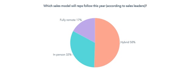 We asked sales leaders which sales model reps will follow this year, and about half will sell both in-person and remotely, while 32% will be selling in-person and 17% will sell remotely.