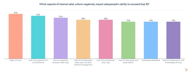 On the other hand, the aspects of sales culture that negatively impact sales reps’ ability to succeed are high turnover, lack of recognition for achievements, toxic competition, a lack of trust, and a lack of clear goals and expectations.
