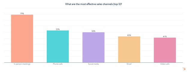 In-person meetings are the most effective sales channel, followed by phone calls, social media, email, and video calls.