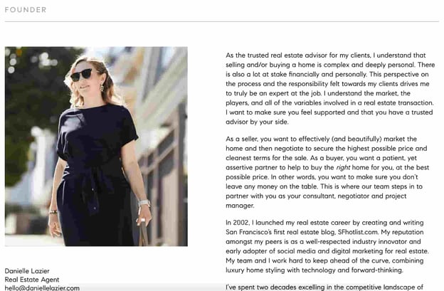 Elizabeth tells a personal story in her bio that highlights her passion for real estate. She provides detail on her real estate background and personal interests. And Elizabeth makes it clear she's passionate about the customer.