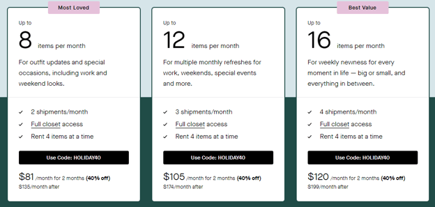 Rent the Runway offers designer clothing and accessories at more affordable prices since the items are rented and returned. They offer the standard three tiers — each differentiated by price, number of items per month, and number of shipments per month. Underneath each tier is a description that helps customers understand which option will best fit their needs.