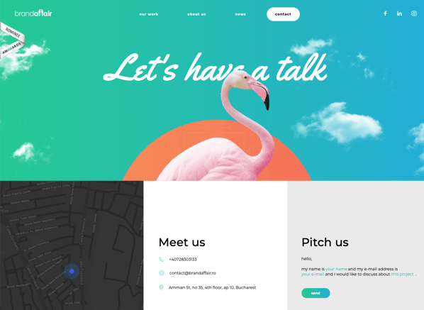 Aside from the obvious pink flamingo, Brandaffair captures the visitor's attention with three methods of communication. The map provides the exact location of the office, the "Meet Us" section includes a phone number and email for general inquiries, and the "Pitch Us" section includes a template that helps businesses submit their ideas directly to the company for consideration.