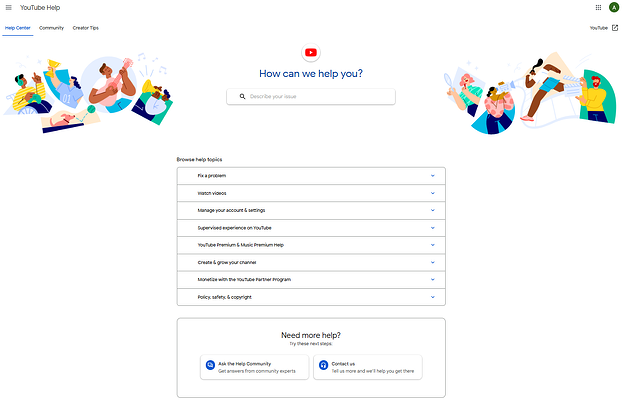 See, for example, how YouTube does it. The video platform organizes all its self-service resources on one clear and well-arranged page. Users can browse the FAQs, ask the YouTube community for assistance, or contact the Help Center, if self-service resources cannot resolve the issue.